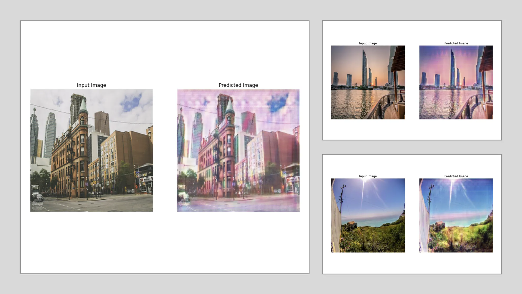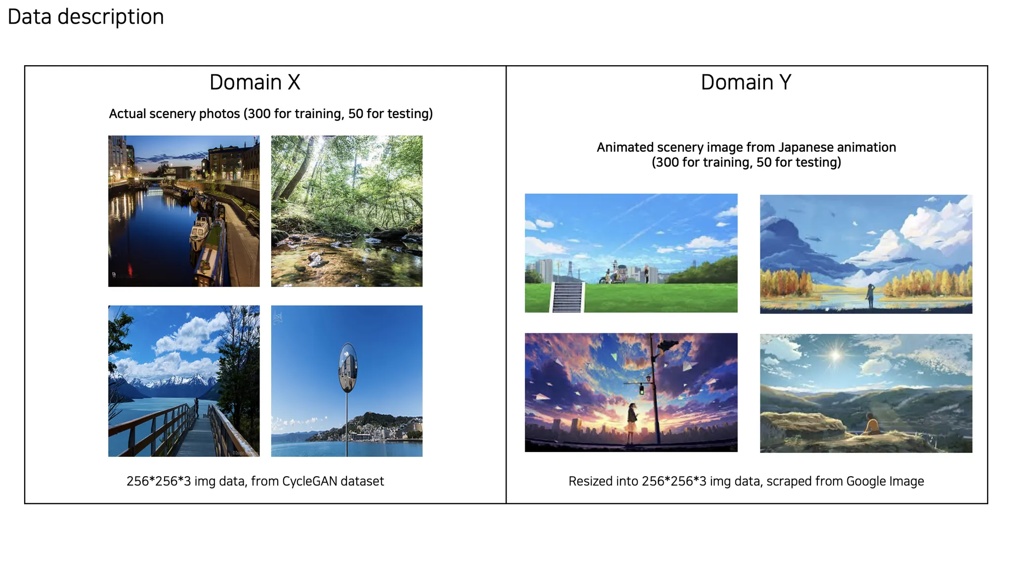 By implementing Cycle-GAN with PyTorch, this project trained a model that transforms images of scenery into a Japanese-animated style. The data for the input domain X consists of 300 images for training and 50 images for testing (2562563), which are from the CycleGAN dataset. The image data for domain Y (style transformation) was collected from Google Images using the Python Selenium library.