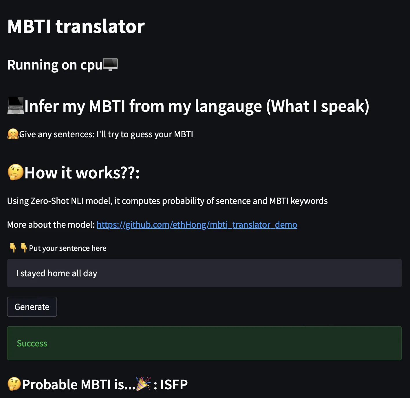 MBTI (Myers-Briggs Type Indicator) is one of the methodologies used to indicate one's personality through a questionnaire, which classifies one's personality into 16 different types based on the responses. However, classifying one's personality based on self-responses can be subjective and somewhat biased. This small project assumes that one's language (how one speaks and what they speak) implies their personality type.