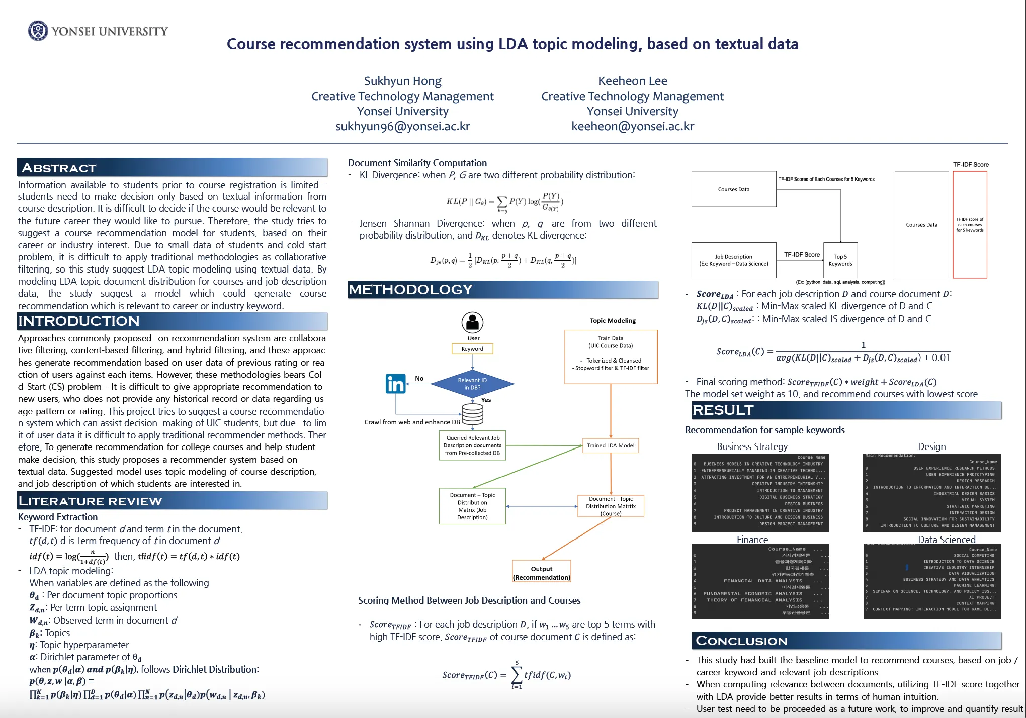 The information available to students prior to course registration is limited. Students need to make decisions based only on textual information from course descriptions. It is difficult to determine if a course would be relevant to the future career they would like to pursue. Therefore, this study aims to suggest a course recommendation model for students based on their career or industry interests. Due to the small amount of student data and the cold start problem, it is challenging to apply traditional methodologies such as collaborative filtering. Instead, this study proposes using LDA topic modeling with textual data. By modeling the LDA topic-document distribution for courses and job descriptions, the study suggests a model that can generate course recommendations relevant to career or industry keywords.